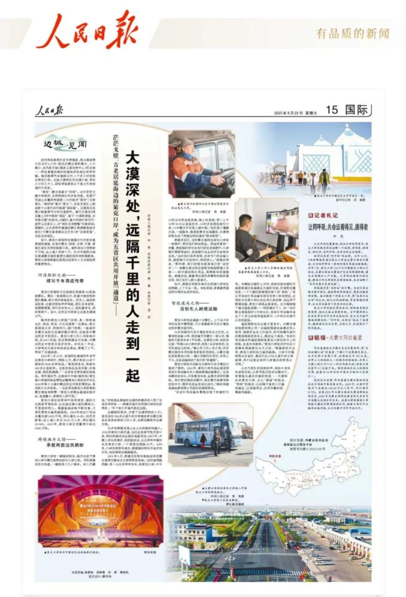 8月22日,《人民日?qǐng)?bào)》國際版“邊城見聞”專欄整版聚焦阿拉善盟策克口岸,以小故事小切口,見證阿拉善盟與周邊經(jīng)貿(mào)往來、人文交流的生動(dòng)實(shí)踐,展示了阿拉善盟高水平對(duì)外開放取得的豐碩成果,唱響了一曲親誠惠容行大道、命運(yùn)與共開新篇的贊歌。全文如下: