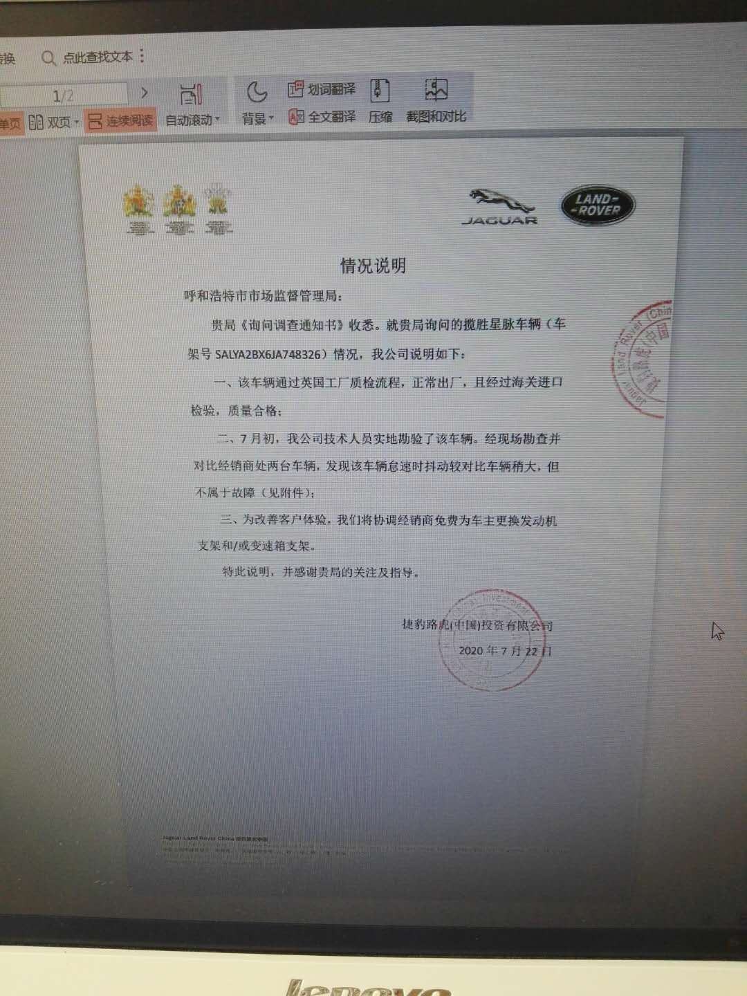 在多個車輛專區(qū)的貼吧里,均有關(guān)于該車型抖動,共振的情況反映。2019年,杭州30多名路虎星脈車主因為車輛共振導(dǎo)致耳鳴的問題,還共同趕到路虎上??偛考w維權(quán)。此事經(jīng)杭州媒體全程曝光,引起廣泛關(guān)注。盡管如此,捷豹路虎(中國)投資有限公司給出的答復(fù)和此次給呼和浩特市市場監(jiān)督管理局的《情況說明》如出一轍,都表示非質(zhì)量問題。