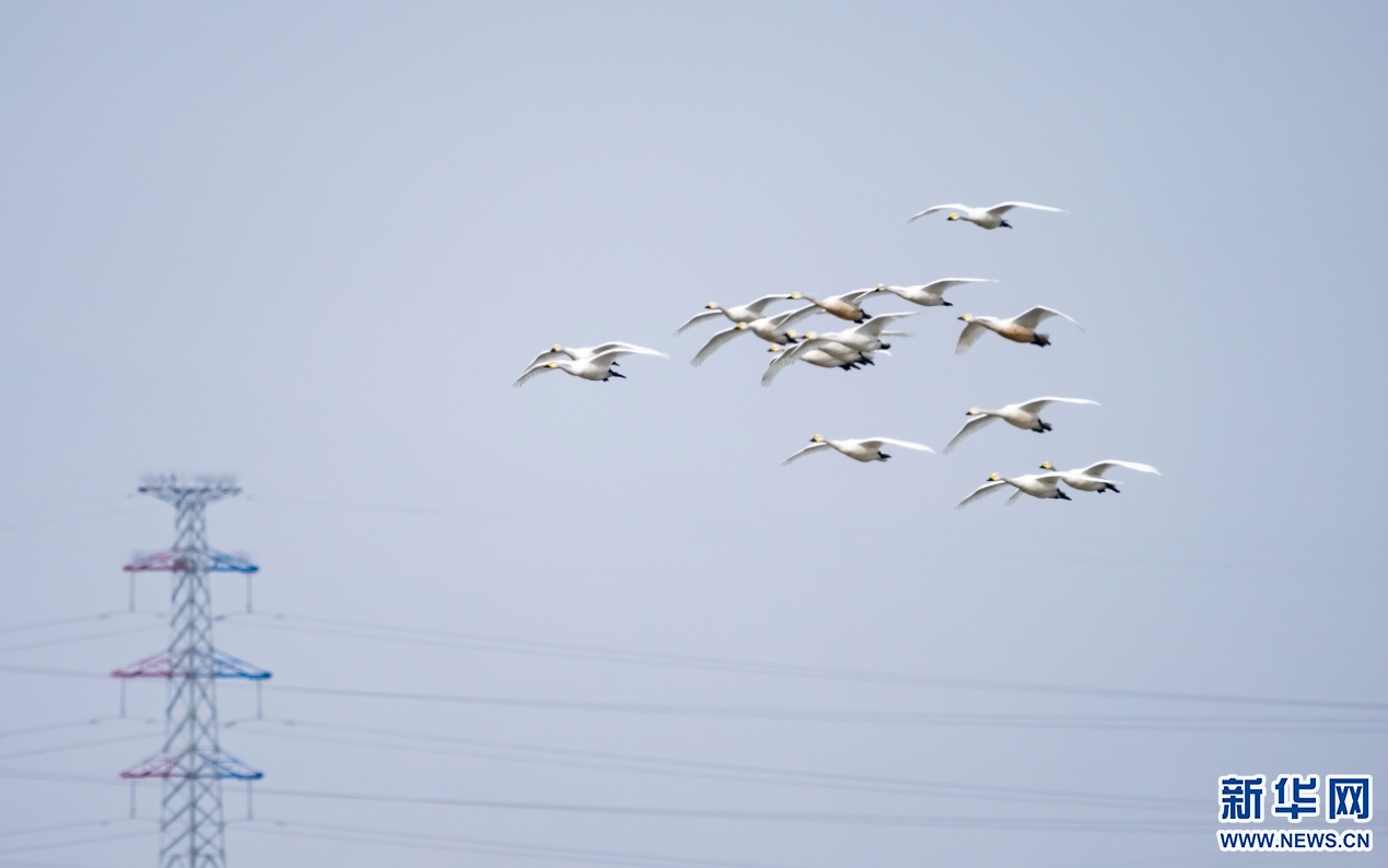 成群的天鵝在土默特左旗海流水庫上空飛翔。新華網(wǎng)發(fā)(陽光 攝)