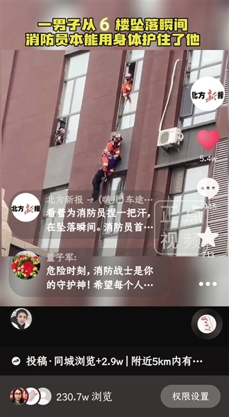 6月25日12時(shí)10分,呼和浩特市彩虹城發(fā)生驚險(xiǎn)一幕:一男子欲跳樓輕生,墜落瞬間,一名消防員飛身拽住了他,本能地用身體將其牢牢護(hù)在懷中,最終,該男子成功獲救。救援的這一幕被熱心市民朱先生用手機(jī)記錄下來并發(fā)布到網(wǎng)上,瞬間引來各地網(wǎng)友圍觀。本報(bào)官方抖音賬號(hào)也發(fā)布了這則視頻,播放量突破230萬(wàn),點(diǎn)贊5.4萬(wàn)。