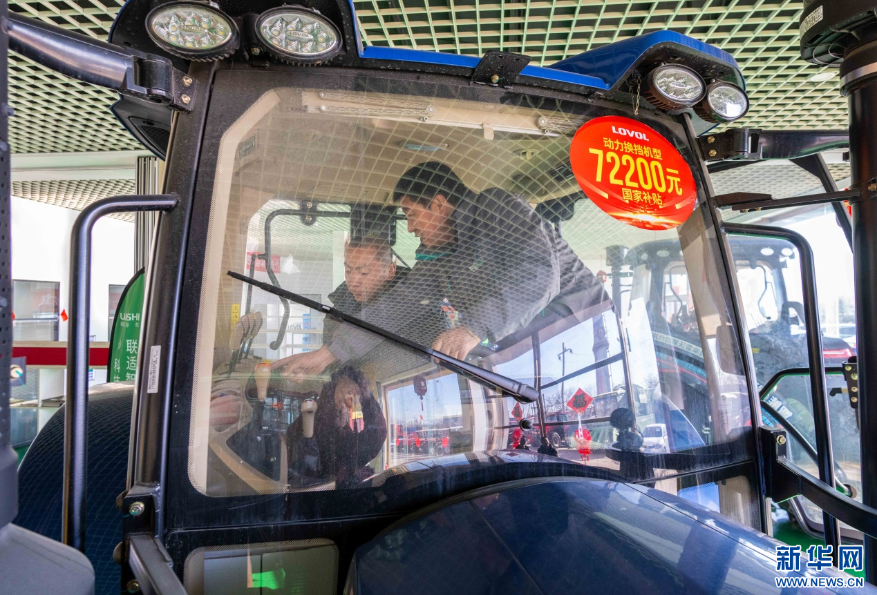 ??2月18日,在位于呼和浩特市玉泉區(qū)的一家農(nóng)機設(shè)備公司展銷大廳,農(nóng)戶在試駕拖拉機。新華網(wǎng)發(fā)(丁根厚 攝)