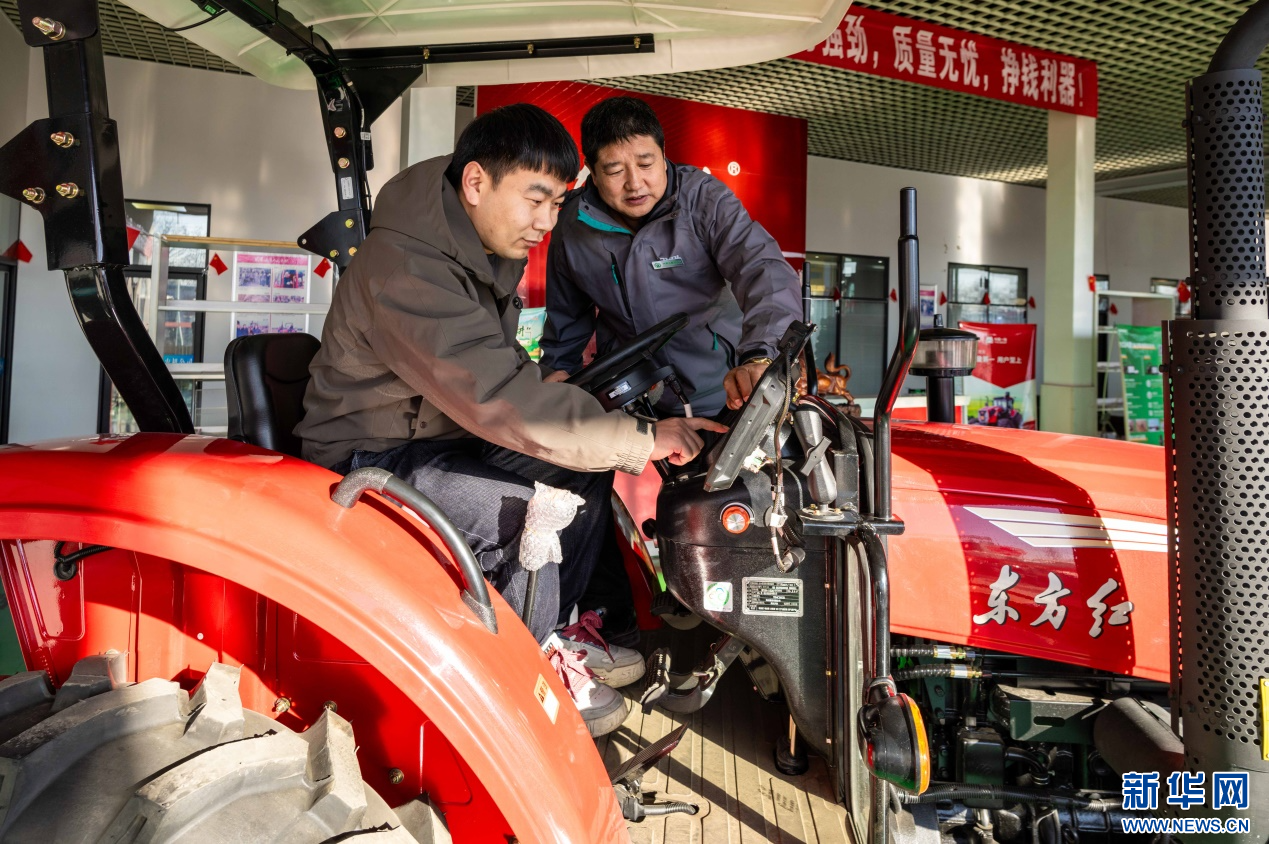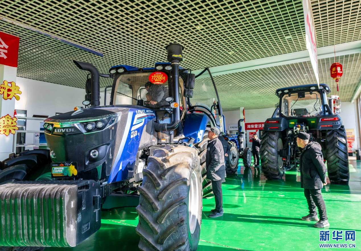 ??2月18日,在位于呼和浩特市玉泉區(qū)的一家農(nóng)機設(shè)備公司展銷大廳,農(nóng)戶在咨詢選購國家補貼拖拉機。新華網(wǎng)發(fā)(丁根厚 攝)
