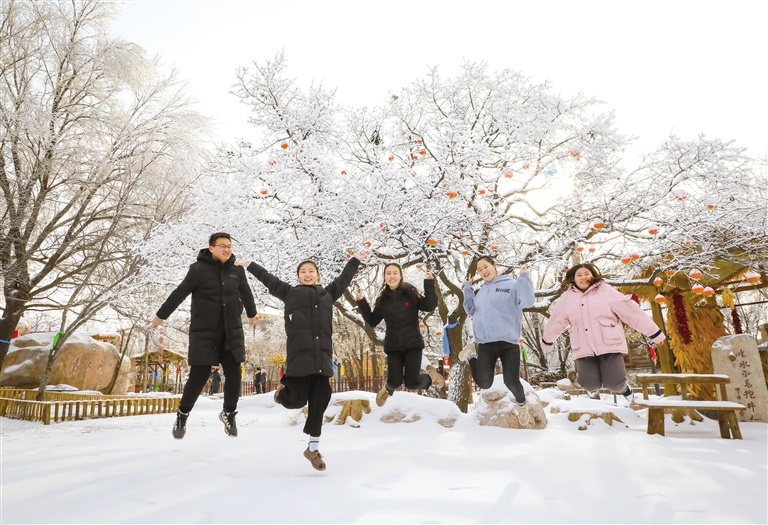1月9日,首府市民在莫尼山非遺小鎮(zhèn)的霧凇前興奮地跳了起來。雖然近期首府并無明顯降雪,但在莫尼山非遺小鎮(zhèn)卻是銀裝素裹的一派隆冬景象,美麗的霧凇吸引了很多市民前來觀賞游玩。