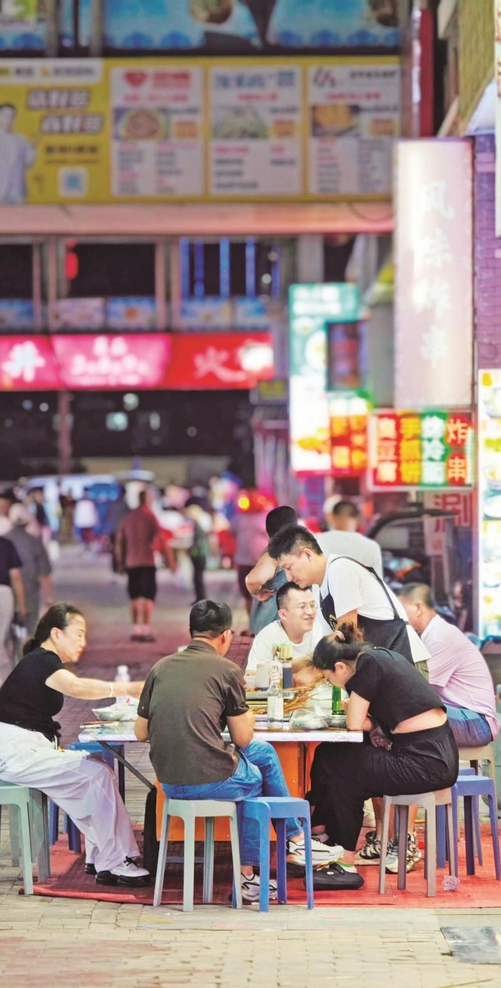 炭火上的羊肉串嗞嗞作響,油脂滴落,迸出金色火花,散發(fā)出誘人的香氣。客人圍坐在塑料小桌旁,手里拿著冰鎮(zhèn)啤酒,碰杯傳出清脆的響聲……這里沒有高檔餐廳的拘謹(jǐn),只有朋友相聚的歡樂和大口吃肉的暢快。大學(xué)生徐瑞虹放暑假后,經(jīng)常和朋友來夜市消暑?!拔覀儙讉€沒事就來萬達(dá)金街轉(zhuǎn)一轉(zhuǎn),天太熱了,待在家里也悶,而且夜市里的這些小吃我們都比較喜歡,沒事幾個人喝幾瓶啤酒,聊一聊天,感覺還是很愜意的?!睂τ谀贻p人來說,夜市不僅是美食的聚集地,更是釋放壓力、享受生活的好去處。在這里,他們可以暫時拋開煩惱,盡情享受美食帶來的快樂。