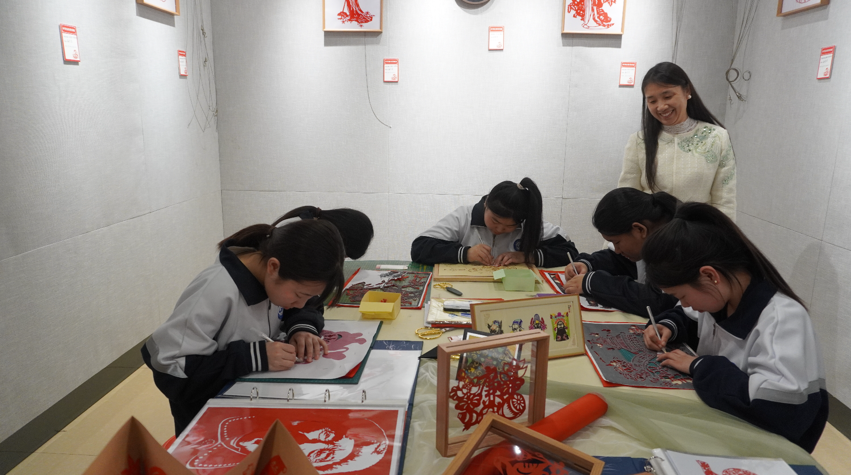 此次展覽的剪紙作品內(nèi)容豐富、制作精致、形式多樣,在傳承傳統(tǒng)剪紙藝術(shù)的同時(shí),注入了新時(shí)代的元素特征,以剪紙藝術(shù)詮釋烏蘭浩特市自然風(fēng)物、傳統(tǒng)建筑與歷史文化之美,展現(xiàn)出剪紙技藝在傳承與發(fā)展中的無(wú)限魅力。觀眾不僅可以近距離感受剪紙的藝術(shù)魅力,還可以參與剪紙,感受中國(guó)傳統(tǒng)文化的博大精深。
