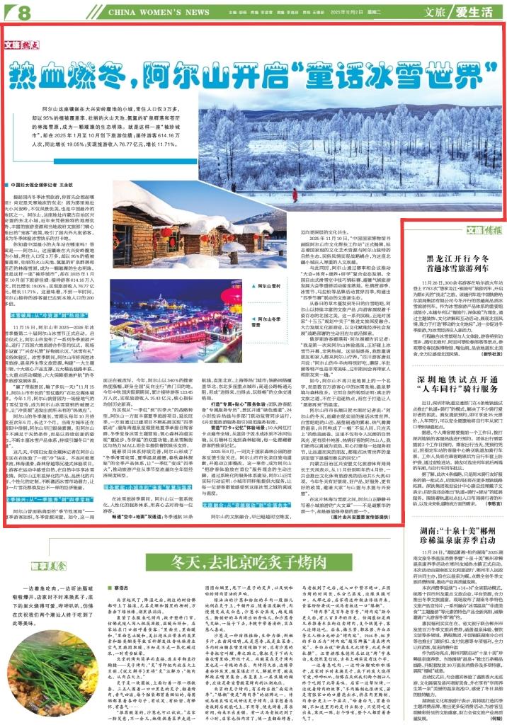 2025年12月2日,《中國婦女報(bào)》第8版刊發(fā)題為《熱血燃冬,阿爾山開啟“童話冰雪世界”》的新聞,報(bào)道了阿爾山,這座地處內(nèi)蒙古自治區(qū)興安盟的東北小城,近年來憑借獨(dú)特的地理優(yōu)勢、豐富的旅游資源和當(dāng)?shù)卣穆貌块T精心推出的“寵客”政策,吸引了國內(nèi)外大批游客,成為冬季體驗(yàn)冰雪快樂的打卡地。