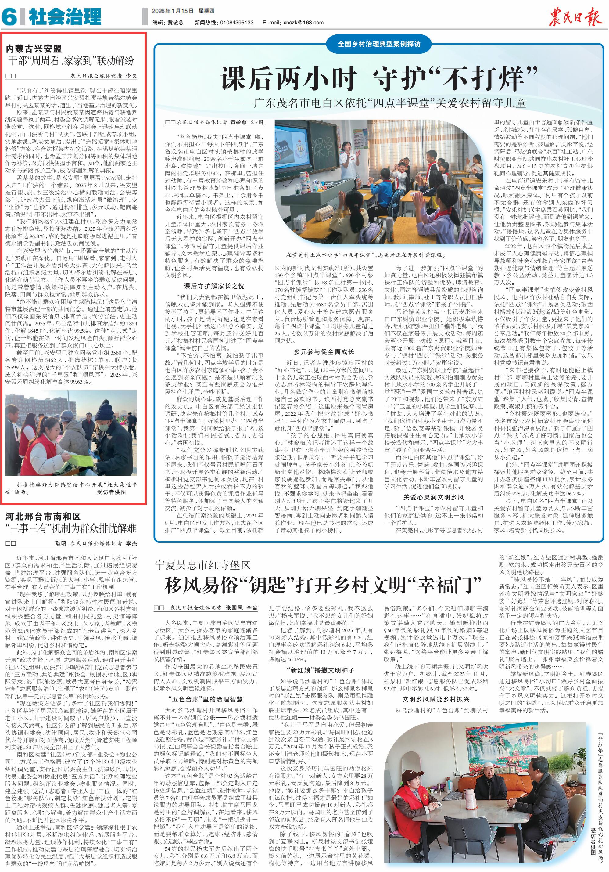 2026年1月15日,《農(nóng)民日報》第6版刊發(fā)題為《內(nèi)蒙古興安盟 干部“周周看、家家到”聯(lián)動解紛》的文章,報道了2025年8月以來,興安盟推行盟、旗、鄉(xiāng)三級綜治中心橫向聯(lián)動司法、公安等部門,讓政法力量下沉,縱向激活基層“微治理”,變“坐診”為“出診”,通過精準排查、多元聯(lián)動、靶向施策,確?!靶∈虏怀龃?、大事不出鎮(zhèn)”。