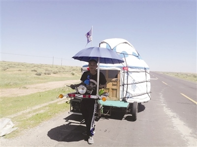 7月31日中午,記者途經(jīng)209國(guó)道錫林郭勒盟蘇尼特左旗路段時(shí),看到一位黢黑健壯的漢子拉著車(chē)走在公路上,兩輪車(chē)上有一座小型的蒙古包。記者下車(chē)和他攀談起來(lái),原來(lái)這個(gè)漢子的心中有個(gè)為期兩年的“英雄夢(mèng)”。