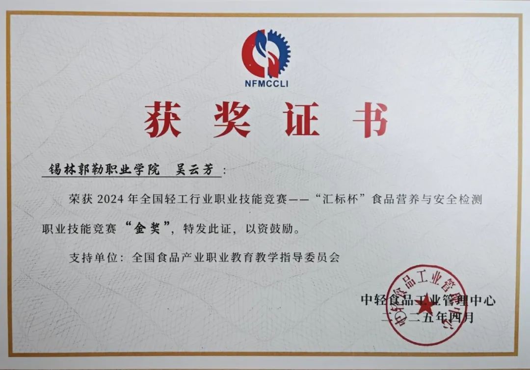 2025年4月21日,由中國(guó)輕工業(yè)聯(lián)合會(huì)、中輕食品工業(yè)管理中心、全國(guó)食品產(chǎn)業(yè)職業(yè)教育教學(xué)指導(dǎo)委員會(huì)等聯(lián)合舉辦的2024年全國(guó)輕工行業(yè)職業(yè)技能競(jìng)賽——“匯標(biāo)杯”食品營(yíng)養(yǎng)與安全檢測(cè)職業(yè)技能競(jìng)賽總決賽在廣州圓滿(mǎn)落幕。錫林郭勒職業(yè)學(xué)院食品檢測(cè)中心總工程師吳云芳同志榮獲金獎(jiǎng)?! ?/p>