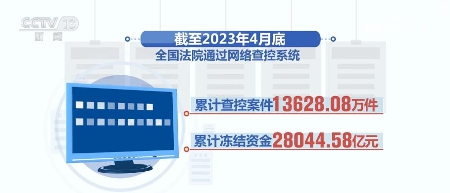 截至2023年4月底,全國法院通過網(wǎng)絡查控系統(tǒng)累計查控案件13628.08萬件,累計凍結(jié)資金28044.58億元,查詢房屋、土地等不動產(chǎn)信息81963.89萬條,車輛19018.00萬輛,證券42195.43億股,漁船和船舶371.79萬艘,網(wǎng)絡資金1009.75億元,有力維護了勝訴當事人合法權(quán)益。