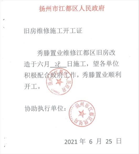 “搞定”西苑社區(qū)后,楊某軍偽造一份《揚(yáng)州市江都區(qū)人民政府舊房維修施工開工證》,并加蓋“揚(yáng)州市江都區(qū)人民政府 178962”“揚(yáng)州市江都區(qū)規(guī)劃局”公章。周女士獲得該證后,立即組織顧先生進(jìn)場(chǎng)施工?!皸钅耻娮屛蚁葔|付材料款和人工費(fèi),后面等財(cái)政撥款就行。我就安排顧先生7月1日進(jìn)場(chǎng)施工?!?/p>