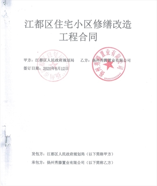 《江都區(qū)住宅小區(qū)修繕改造工程合同》封面,上面蓋有“揚(yáng)州市江都區(qū)規(guī)劃局”的假章。