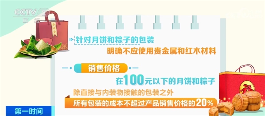 針對月餅和粽子的包裝,明確不應使用貴金屬和紅木材料;銷售價格在100元以下的月餅和粽子,除直接與內裝物接觸的包裝之外,所有包裝的成本不超過產(chǎn)品銷售價格的20%;售價在100元以上的,包裝成本不超過產(chǎn)品銷售價格的15%。