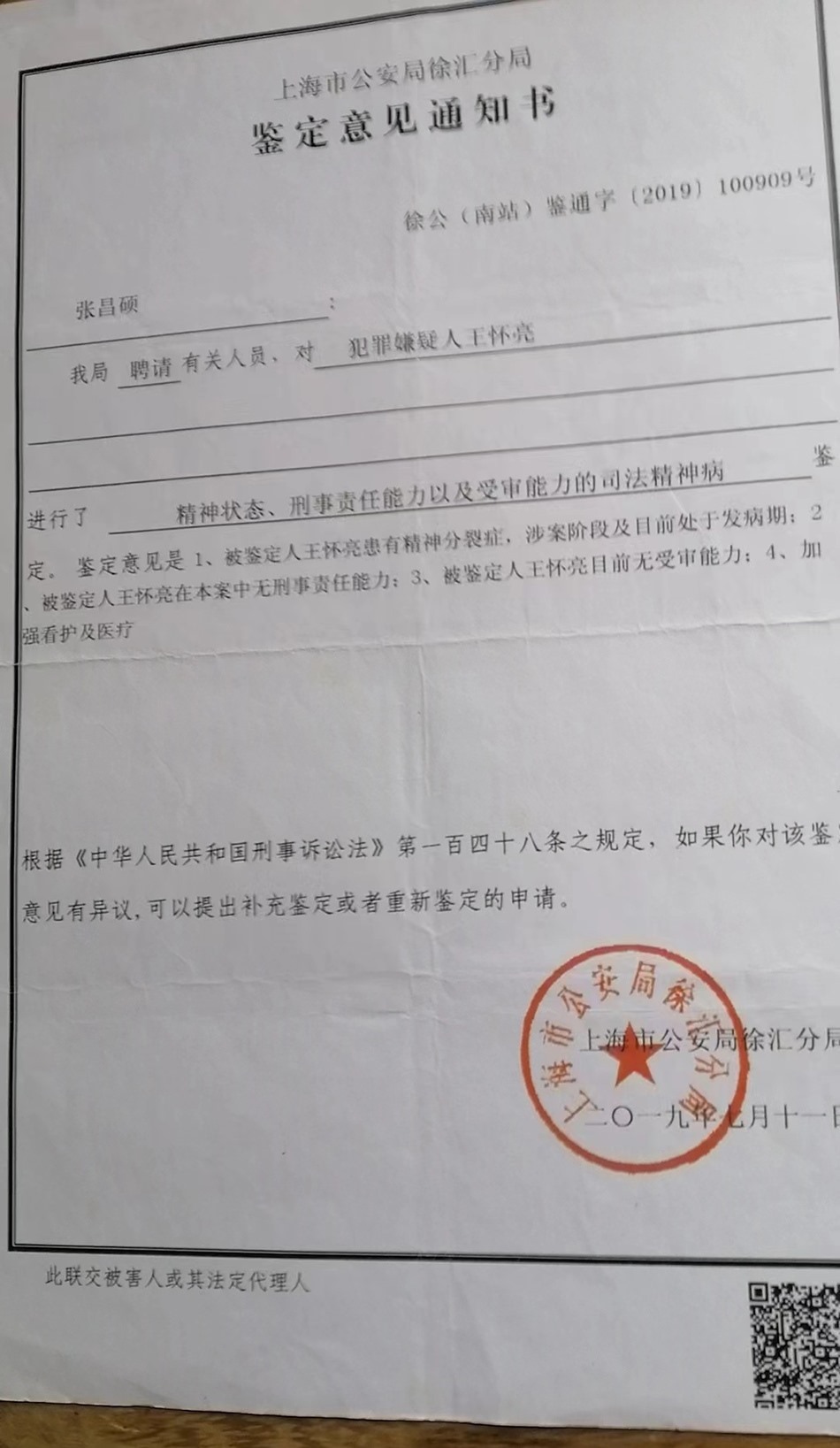 另一份是犯罪嫌疑人王懷亮的“精神狀態(tài)、刑事責(zé)任能力以及受審能力的司法精神病”鑒定書,寫道:王懷亮患有精神分裂癥,涉案階段及目前處于發(fā)病期;在本案中無刑事責(zé)任能力;目前無受審能力;加強看護及醫(yī)療。
