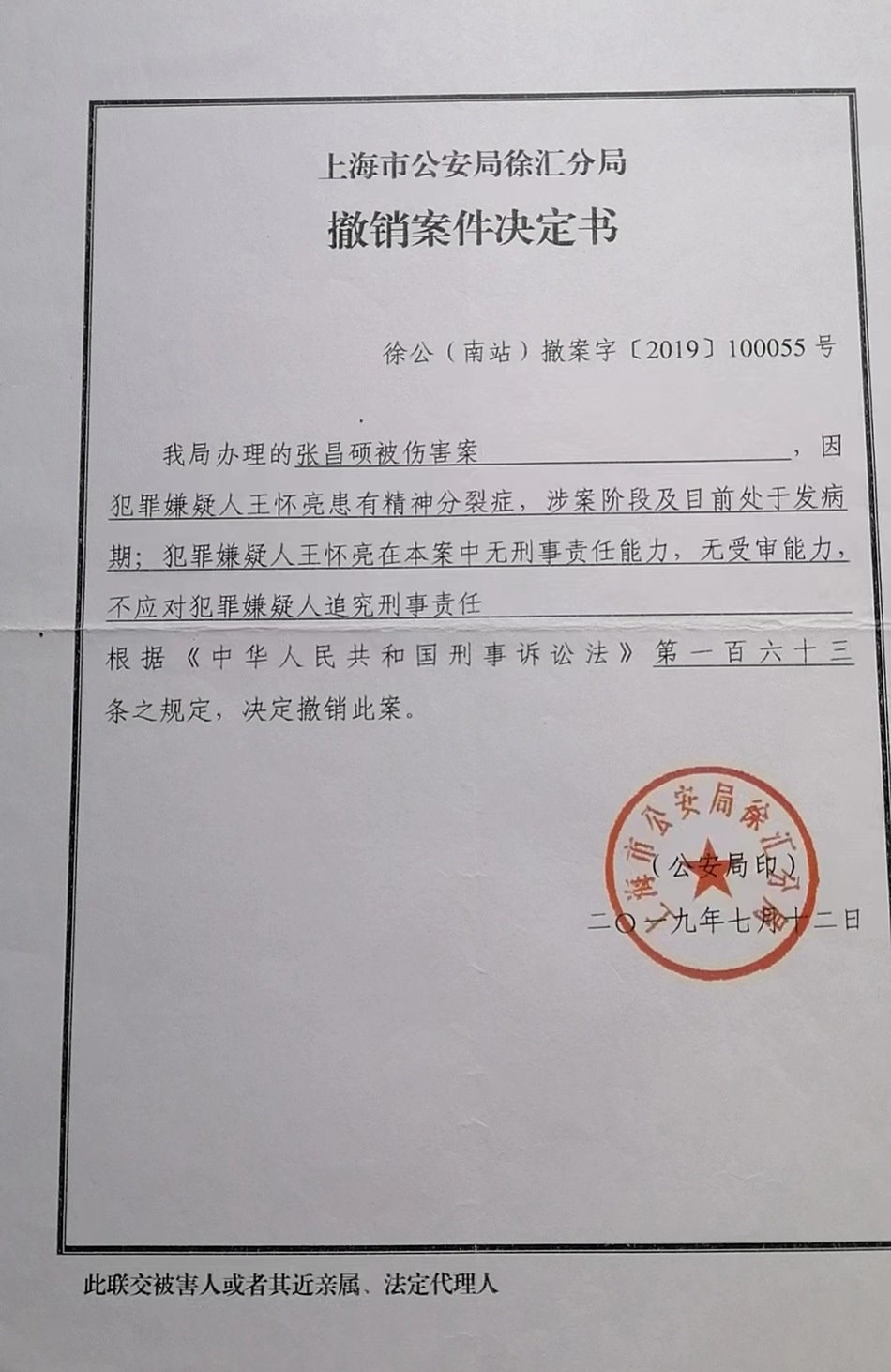 張宏銀回憶,他已經(jīng)不記得這起依法不負刑事責(zé)任的精神病人強制醫(yī)療程序案件開庭審理的具體時間,只記得是2019年下半年的一天上午,那天犯罪嫌疑人沒有到場,律師也沒有到場,檢察院的兩位人員出席了開庭。徐匯區(qū)法院當(dāng)庭做出判決:王懷亮被送往醫(yī)療機構(gòu)進行強制醫(yī)療。2019年7月12日,張宏銀收到公安局的撤銷案件決定書。