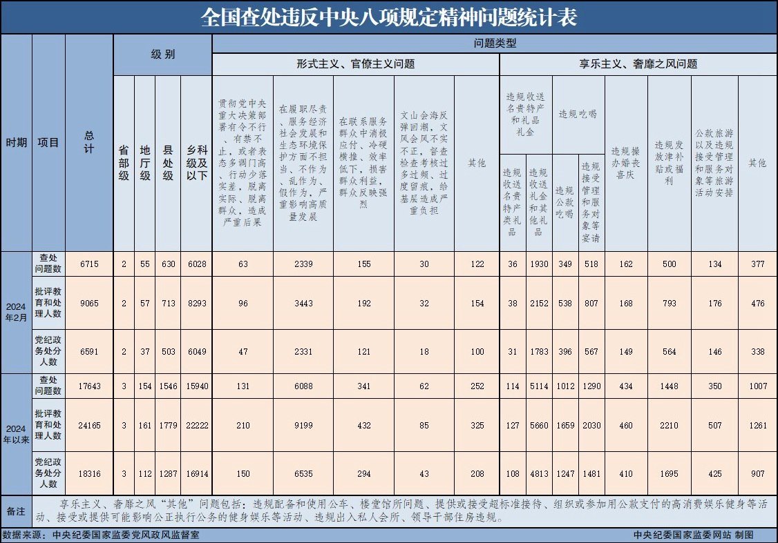 央視網(wǎng)消息:3月26日,中央紀(jì)委國家監(jiān)委公布了2024年2月全國查處違反中央八項(xiàng)規(guī)定精神問題匯總情況。當(dāng)月,全國共查處違反中央八項(xiàng)規(guī)定精神問題6715起,批評(píng)教育和處理9065人,其中黨紀(jì)政務(wù)處分6591人,這是連續(xù)第126個(gè)月公布月報(bào)數(shù)據(jù)。