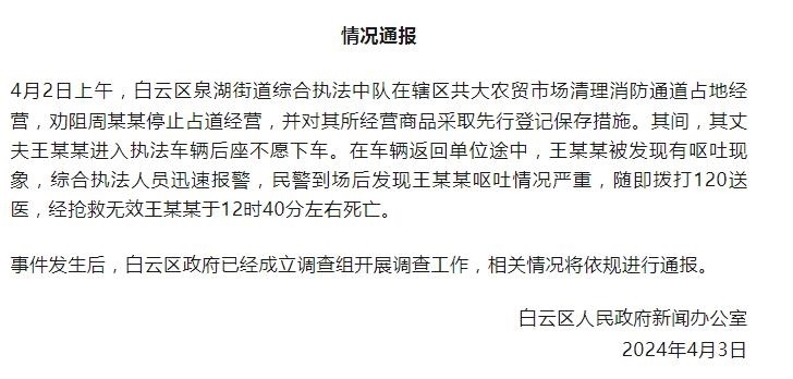 央視網(wǎng)消息:據(jù)貴陽網(wǎng)官微消息,4月3日,貴陽市白云區(qū)人民政府新聞辦公室通報,4月2日上午,白云區(qū)泉湖街道綜合執(zhí)法中隊在轄區(qū)共大農(nóng)貿(mào)市場清理消防通道占地經(jīng)營,勸阻周某某停止占道經(jīng)營,并對其所經(jīng)營商品采取先行登記保存措施。其間,其丈夫王某某進入執(zhí)法車輛后座不愿下車。在車輛返回單位途中,王某某被發(fā)現(xiàn)有嘔吐現(xiàn)象,綜合執(zhí)法人員迅速報警,民警到場后發(fā)現(xiàn)王某某嘔吐情況嚴(yán)重,隨即撥打120送醫(yī),經(jīng)搶救無效王某某于12時40分左右死亡。
