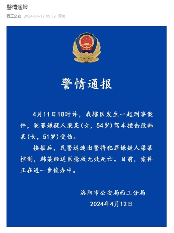 央視網(wǎng)消息:洛陽市公安局西工分局4月12日通報,4月11日18時許,該轄區(qū)發(fā)生一起刑事案件,犯罪嫌疑人梁某(女,54歲)駕車撞擊致韓某(女,51歲)受傷。接報后,民警迅速出警將犯罪嫌疑人梁某控制,韓某經(jīng)送醫(yī)搶救無效死亡。目前,案件正在進一步偵辦中。