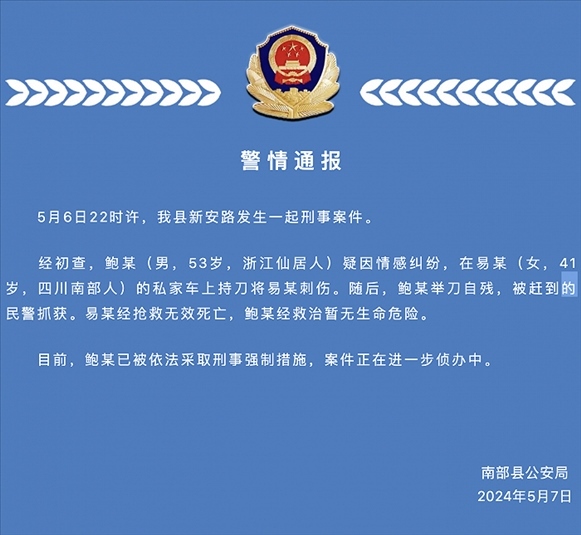 ·四川南部縣警方:男子持刀刺死一女子后自殘,已被采取刑事強制措施。