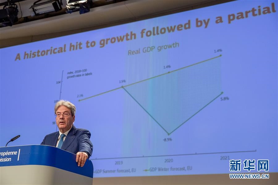 這是7月7日,負責經濟事務的歐委會委員保羅·真蒂洛尼在位于比利時布魯塞爾的歐盟委員會總部就歐盟經濟預測出席新聞發(fā)布會。歐盟7日發(fā)布夏季經濟預測報告說,由于放松新冠疫情防控措施的步伐比原計劃緩慢,歐盟和歐元區(qū)今年經濟萎縮程度將比此前預期更嚴重,明年復蘇也將更緩慢。新華社發(fā)(歐盟供圖)