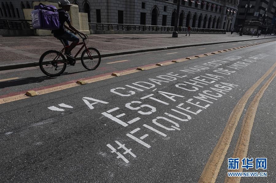這是4月21日,巴西圣保羅市的一條道路上寫有“城市不是空的,而是充滿著鄰里間的關愛#待在家中”字樣。新華社發(fā)(拉赫爾·帕特拉索攝)