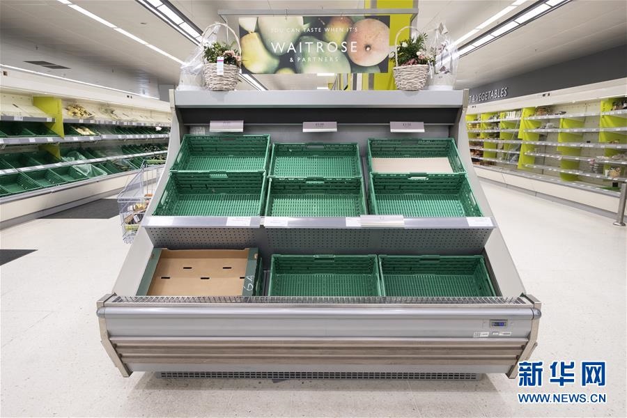 這是3月21日在英國倫敦拍攝的一家超市內空空的貨架。新華社記者韓巖攝