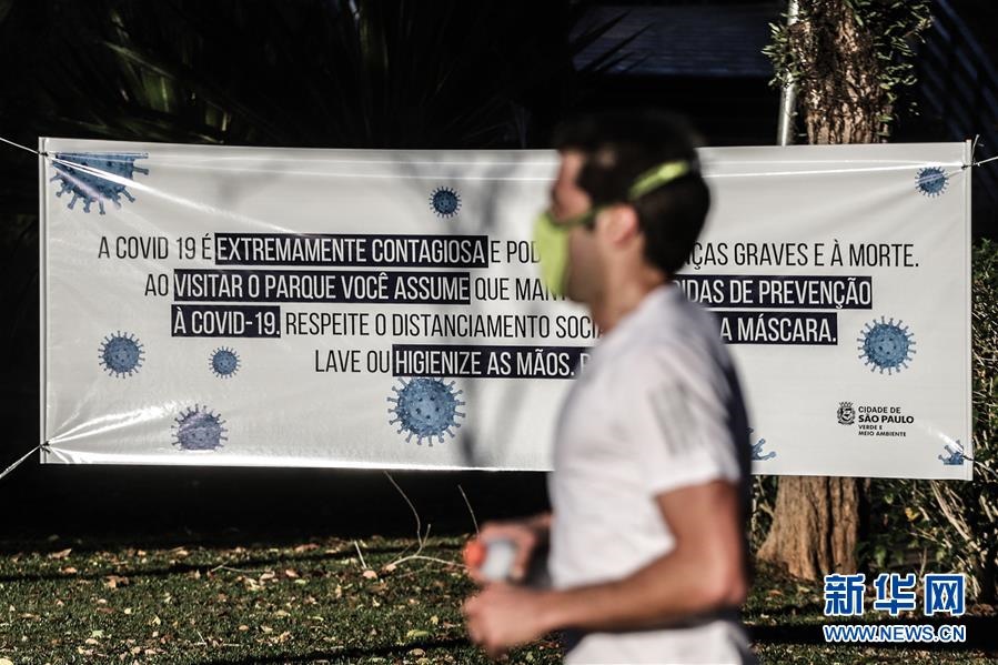這是7月13日,在巴西圣保羅市重新開放的伊比拉普埃拉公園內,一名男子經過提醒游客做好防護的條幅。新華社發(fā)(拉赫爾·帕特拉索攝)