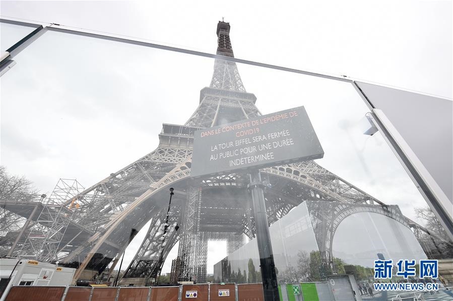 這是3月14日,在法國巴黎,埃菲爾鐵塔下豎立著“因新冠肺炎疫情而無限期關閉”的告示牌。新華社發(fā)(杰克·陳攝)