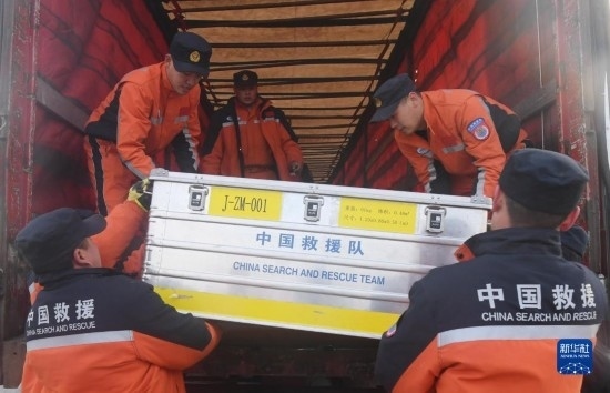 2月16日,在土耳其哈塔伊省安塔基亞市,中國(guó)救援隊(duì)隊(duì)員搬運(yùn)設(shè)備。