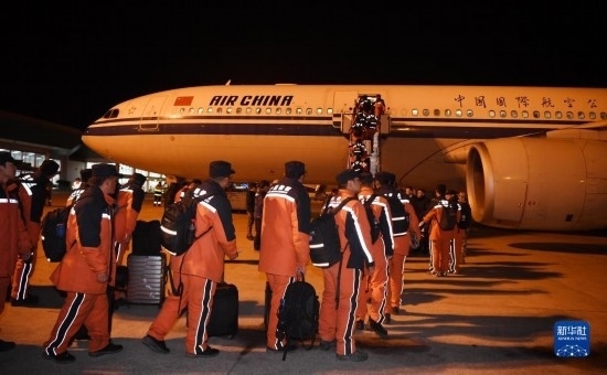 2月16日,中國(guó)救援隊(duì)隊(duì)員在土耳其阿達(dá)納國(guó)際機(jī)場(chǎng)乘坐國(guó)航包機(jī)回國(guó)。
