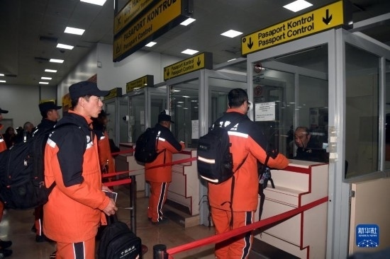 2月16日,中國(guó)救援隊(duì)隊(duì)員在土耳其阿達(dá)納國(guó)際機(jī)場(chǎng)辦理乘機(jī)手續(xù)。