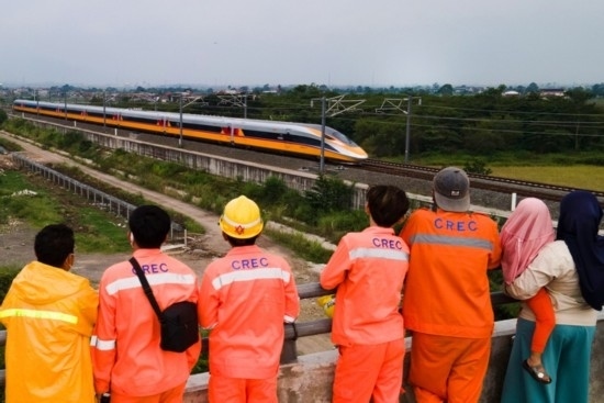 2022年11月16日,在印度尼西亞萬隆,雅萬高鐵建設(shè)者和當(dāng)?shù)孛癖娪^看高速鐵路綜合檢測(cè)車行駛在雅萬高鐵試驗(yàn)段(無人機(jī)照片)。新華社發(fā)(李培養(yǎng) 攝)