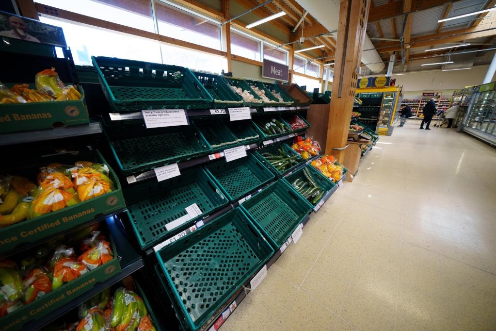 2月23日,在英國(guó)曼徹斯特,一家超市的水果和蔬菜貨架出現(xiàn)缺貨。新華社發(fā)(喬恩·休珀攝)