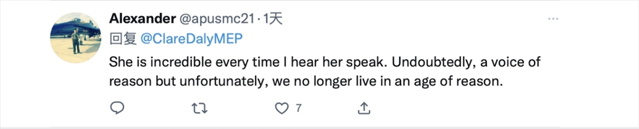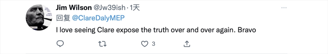 克萊爾·戴利28日在推特上發(fā)布了一條她于19日在歐洲議會全體會議上發(fā)言的視頻,她在視頻上方配文稱,“針對中國可恥的殖民傲慢應(yīng)該留在過去。問題很簡單。我們是想成為我們大西洋朋友的附庸,還是想與我們最大的貿(mào)易伙伴保持和平、獨立的關(guān)系?這個伙伴40年來沒有向任何人投過一顆炸彈?!?/p>