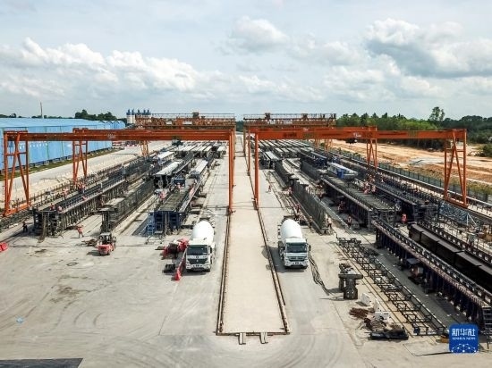 這是4月26日在馬來(lái)西亞吉蘭丹州拍攝的馬東鐵項(xiàng)目一分部制梁場(chǎng)(無(wú)人機(jī)拍攝)。新華社記者 朱煒 攝