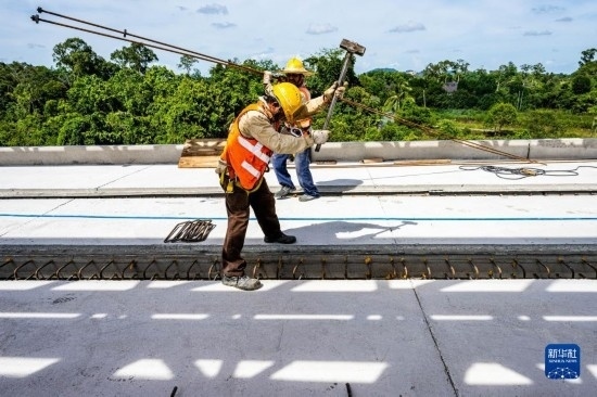 4月26日,工人在馬來(lái)西亞吉蘭丹州的馬東鐵項(xiàng)目一分部5號(hào)橋建設(shè)現(xiàn)場(chǎng)工作。新華社記者 朱煒 攝