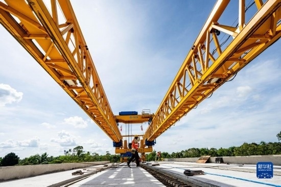 4月26日,工人在馬來(lái)西亞吉蘭丹州的馬東鐵項(xiàng)目一分部制梁場(chǎng)工作。新華社記者 朱煒 攝