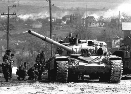 這是1999年3月24日,南聯(lián)盟軍隊的一輛坦克在科索沃省德雷尼察地區(qū)待命,隨時準(zhǔn)備戰(zhàn)斗。新華社發(fā)