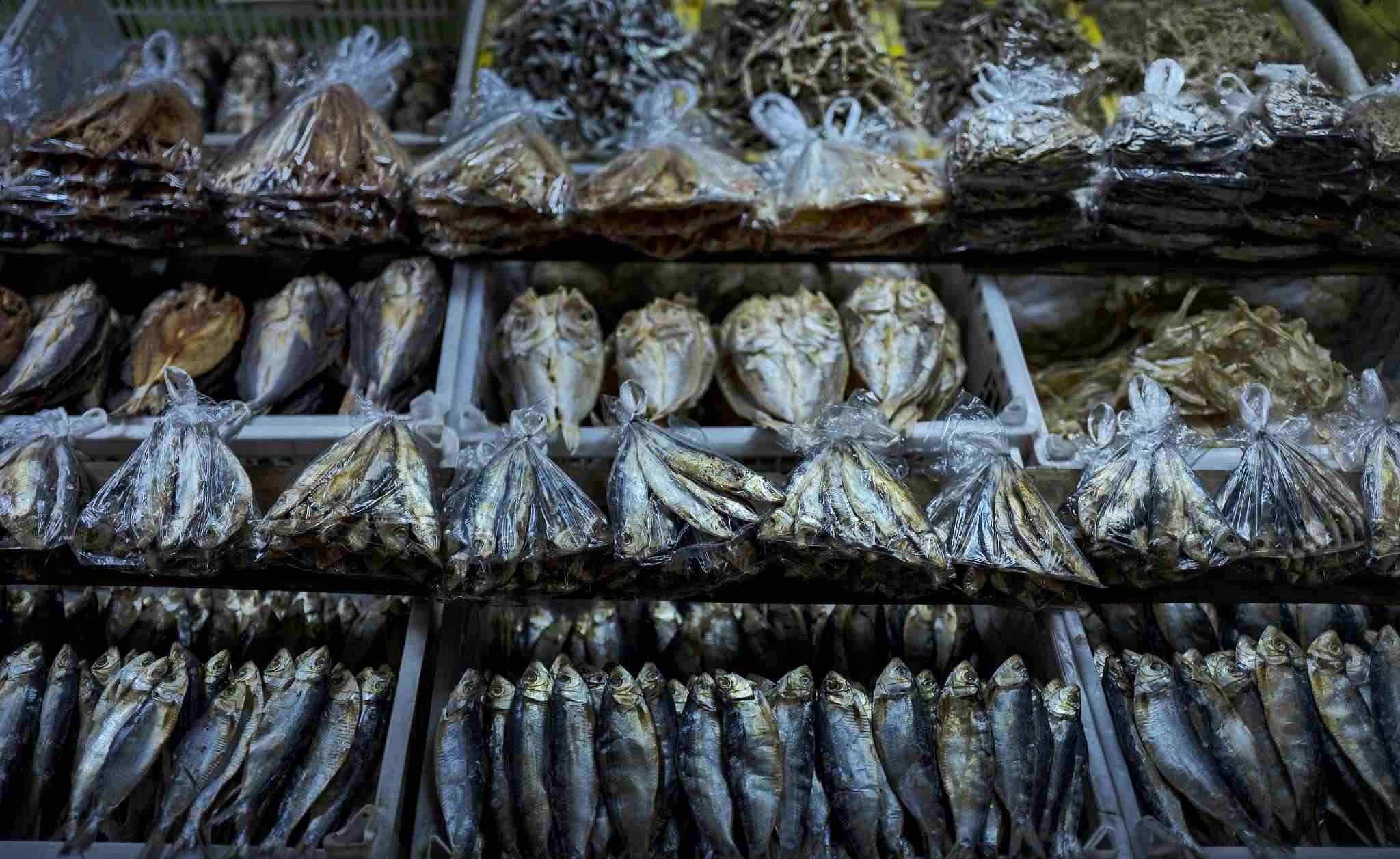 當?shù)貢r間2023年4月19日,菲律賓馬尼拉菜市場上,用塑料袋包裹著的魚干。