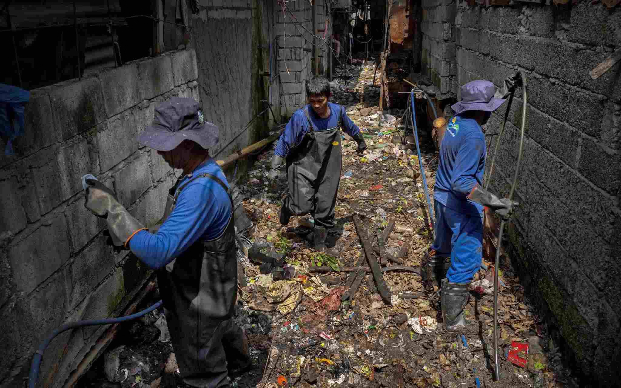 當?shù)貢r間2023年4月15日,菲律賓馬尼拉,工人們清理一條被塑料垃圾堵塞的小溪。