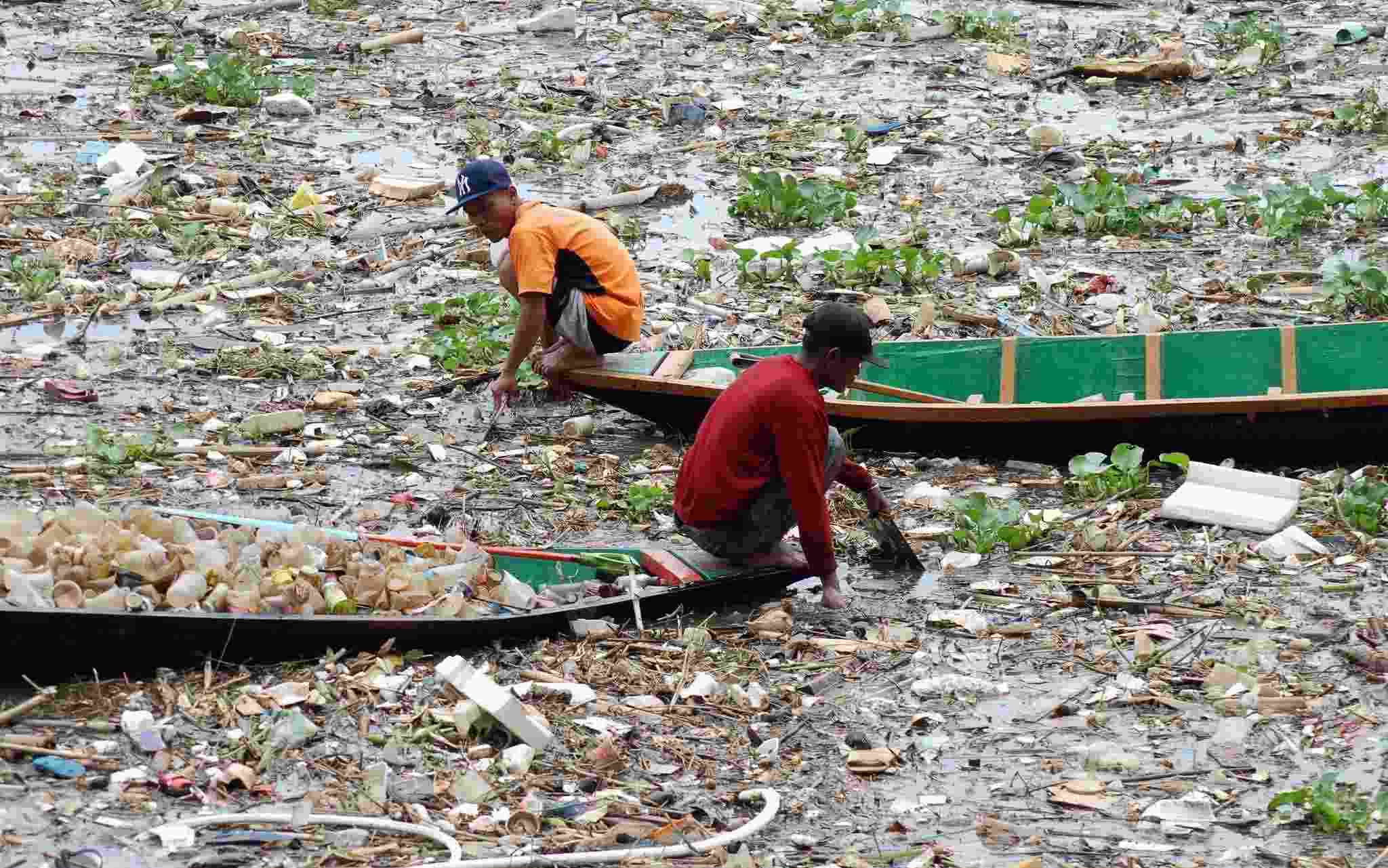 當?shù)貢r間2023年3月28日,印度尼西亞萬隆,兩名工人在芝塔龍河道中收集塑料。