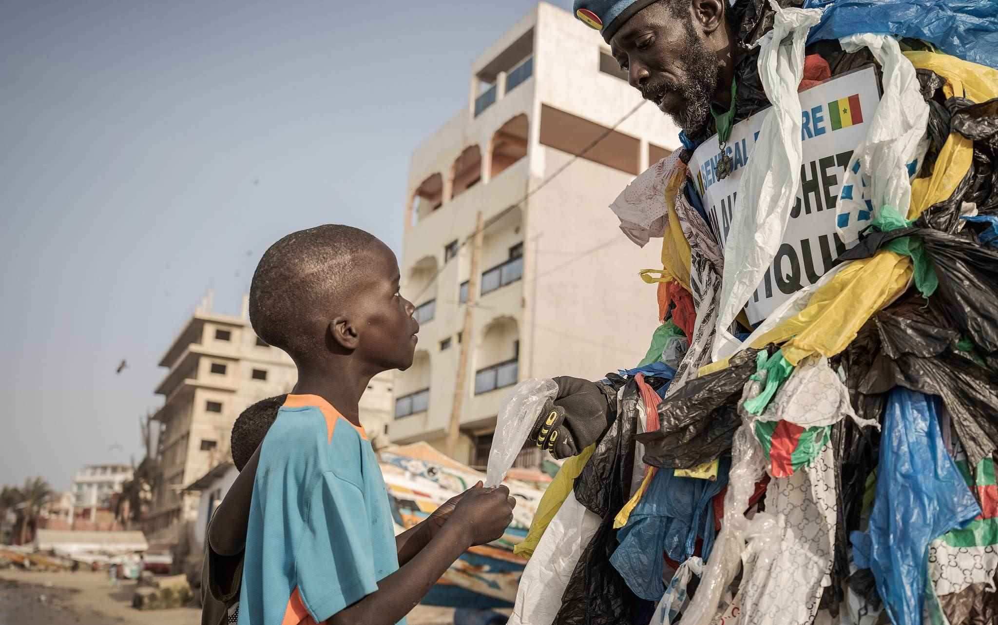 當?shù)貢r間2023年4月5日,塞內加爾達喀爾,49歲的塞內加爾環(huán)?;顒蛹夷拧し?,被稱為“塑料人”,和一個孩子在海灘上散步時拿著一個塑料包裝,提醒人們注意使用一次性塑料的污染。