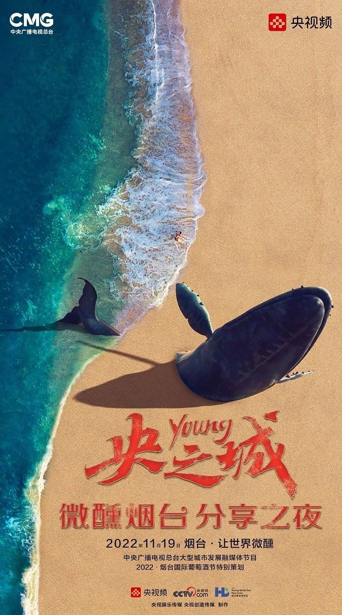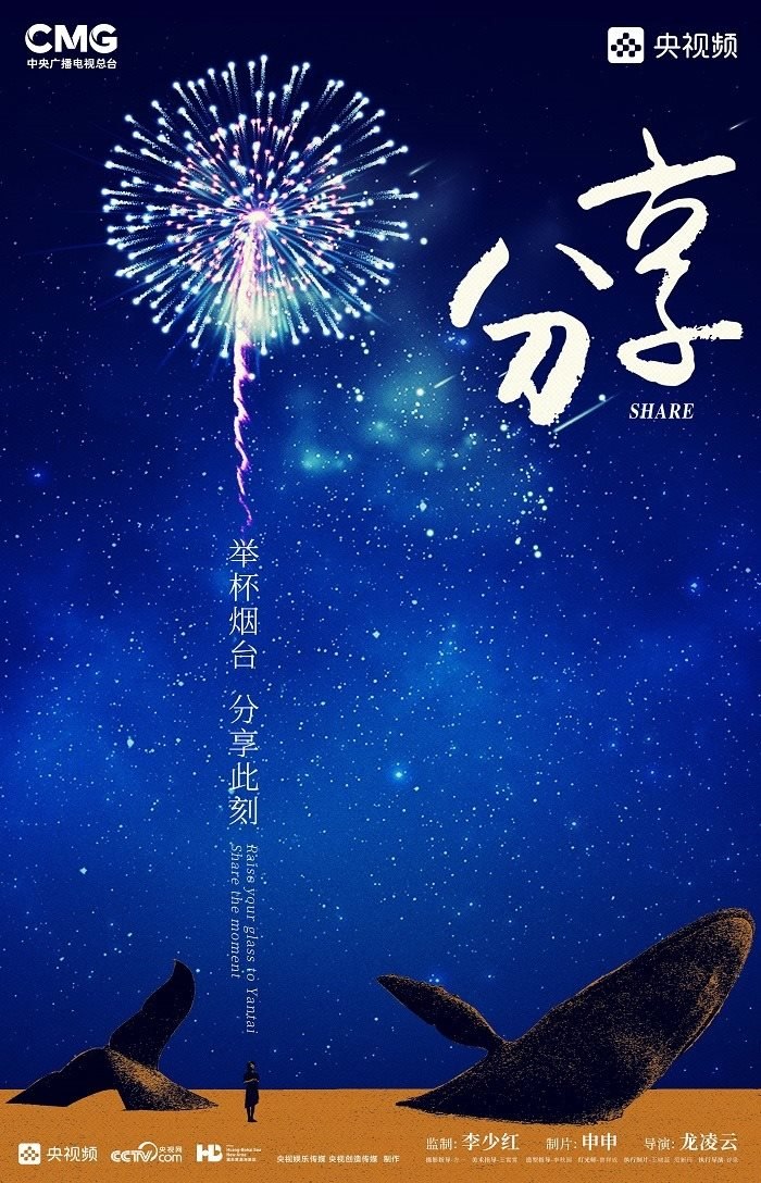 田雨峰在拍攝短片海報(bào)用圖的時(shí)候,首先確定了畫(huà)面中最突出的形象元素,同時(shí)也是交代短片故事發(fā)生地的地標(biāo)性雕塑——“孤獨(dú)的鯨“。這個(gè)雕塑如今是煙臺(tái)開(kāi)發(fā)區(qū)金沙灘的網(wǎng)紅打卡地,網(wǎng)友為其起名”鯨落“。碩大的鯨魚(yú)從淺海處躍出海面,魚(yú)頭和魚(yú)尾凌空飛躍,其身體的一部分似藏在沙灘里。這是一個(gè)在真實(shí)生活中不會(huì)出現(xiàn)的景象,充滿了動(dòng)畫(huà)般的奇幻想象,位于煙臺(tái)碧藍(lán)的海邊,又天然地帶上了一點(diǎn)浪漫的色彩。短片中”舉杯煙臺(tái),分享此刻“的Slogan綴在尾聲,分享的正是煙臺(tái)這座城市獨(dú)有的沙灘、夜空、煙火和人間。短片中可以娓娓道來(lái)般逐漸交代,但在海報(bào)里,二環(huán)用畫(huà)面底部金色沙灘上”孤獨(dú)的鯨“,畫(huà)面上方如大海般湛藍(lán)的星空,星空中綻放的煙花,鎖定了地球上唯一的煙臺(tái)。田雨峰鏡頭中短片主角的人物照被二環(huán)拼貼到童話般色彩斑斕的畫(huà)面里,被著意縮小了的黑色小女孩于是成為一切奇幻、浪漫想象的迸發(fā)之源,和世界分享一個(gè)妙趣橫生的想法。