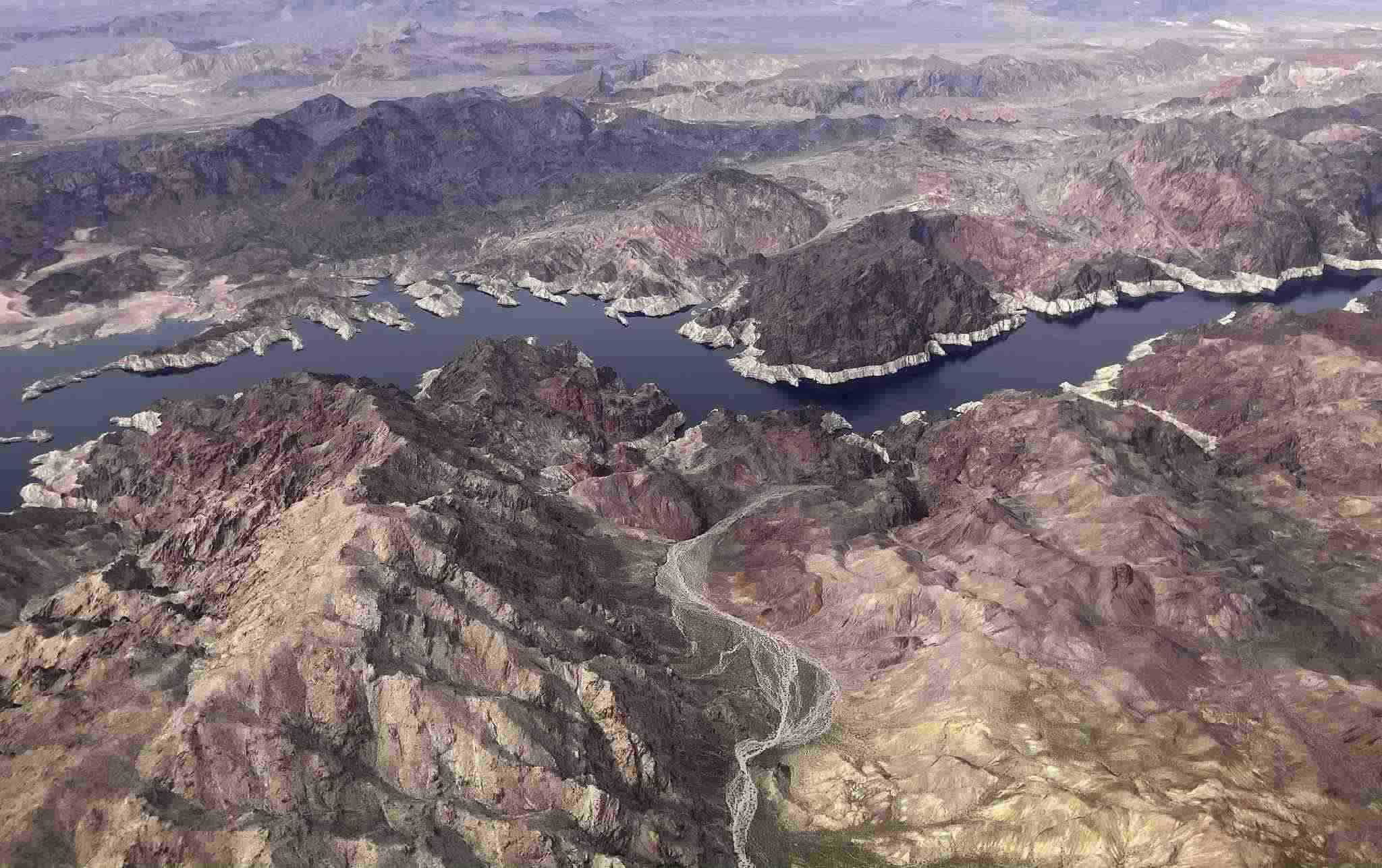當(dāng)?shù)貢r(shí)間2023年3月6日,美國內(nèi)華達(dá)州博爾德市,沿著內(nèi)華達(dá)州和亞利桑那州的邊界,“浴缸環(huán)”顯示了米德湖的水位線。