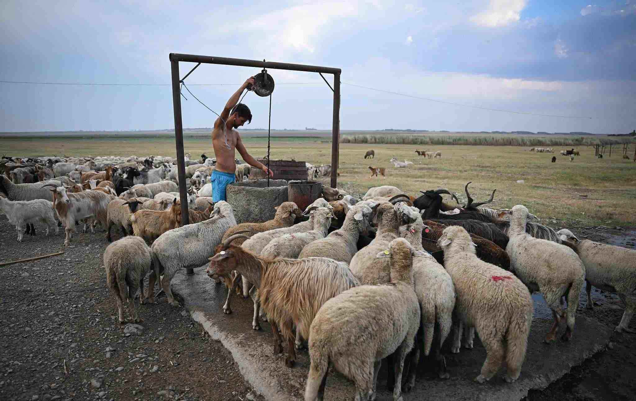 當(dāng)?shù)貢r(shí)間2022年7月28日,羅馬尼亞斯洛博齊亞,牧羊人在阿瑪拉湖床旁的井打水。