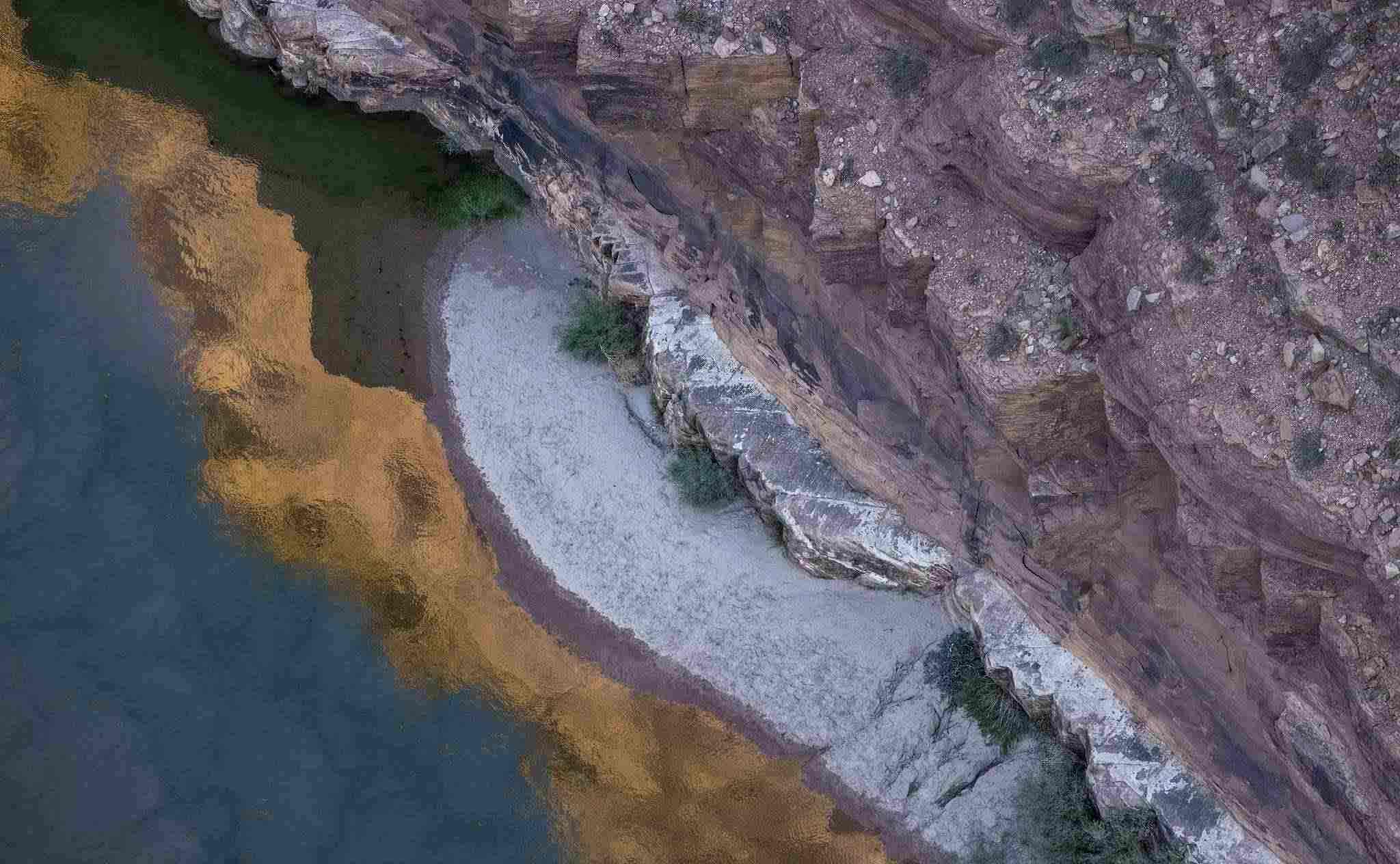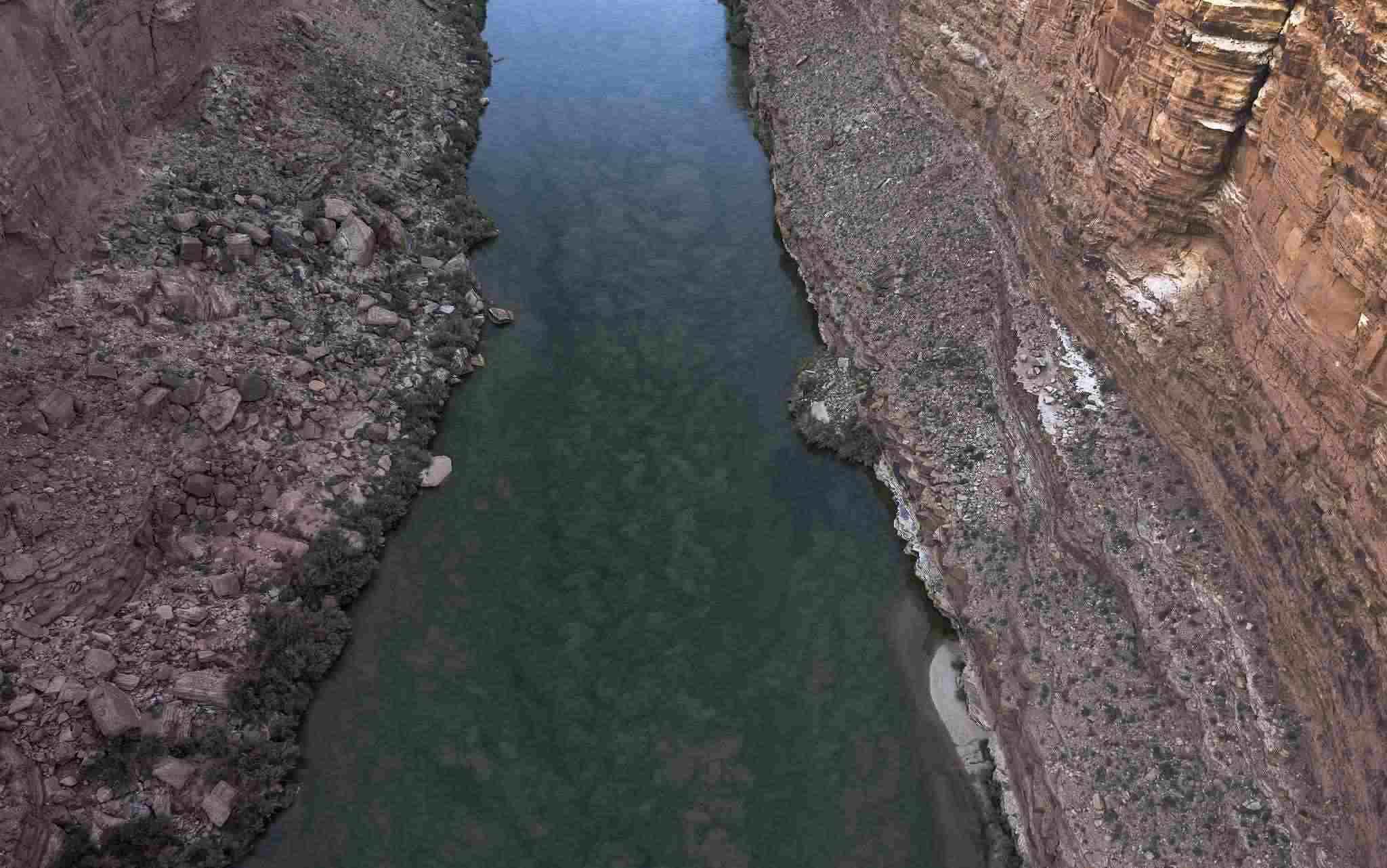 當(dāng)?shù)貢r(shí)間2022年8月31日,美國亞利桑那州大理石峽谷,當(dāng)沉積物在流經(jīng)鮑威爾湖下游的大理石峽谷時(shí),紅色砂巖懸崖倒映在科羅拉多河中。近幾年,氣候變化導(dǎo)致的干旱使美國第二大水庫鮑威爾湖的水位下降。
