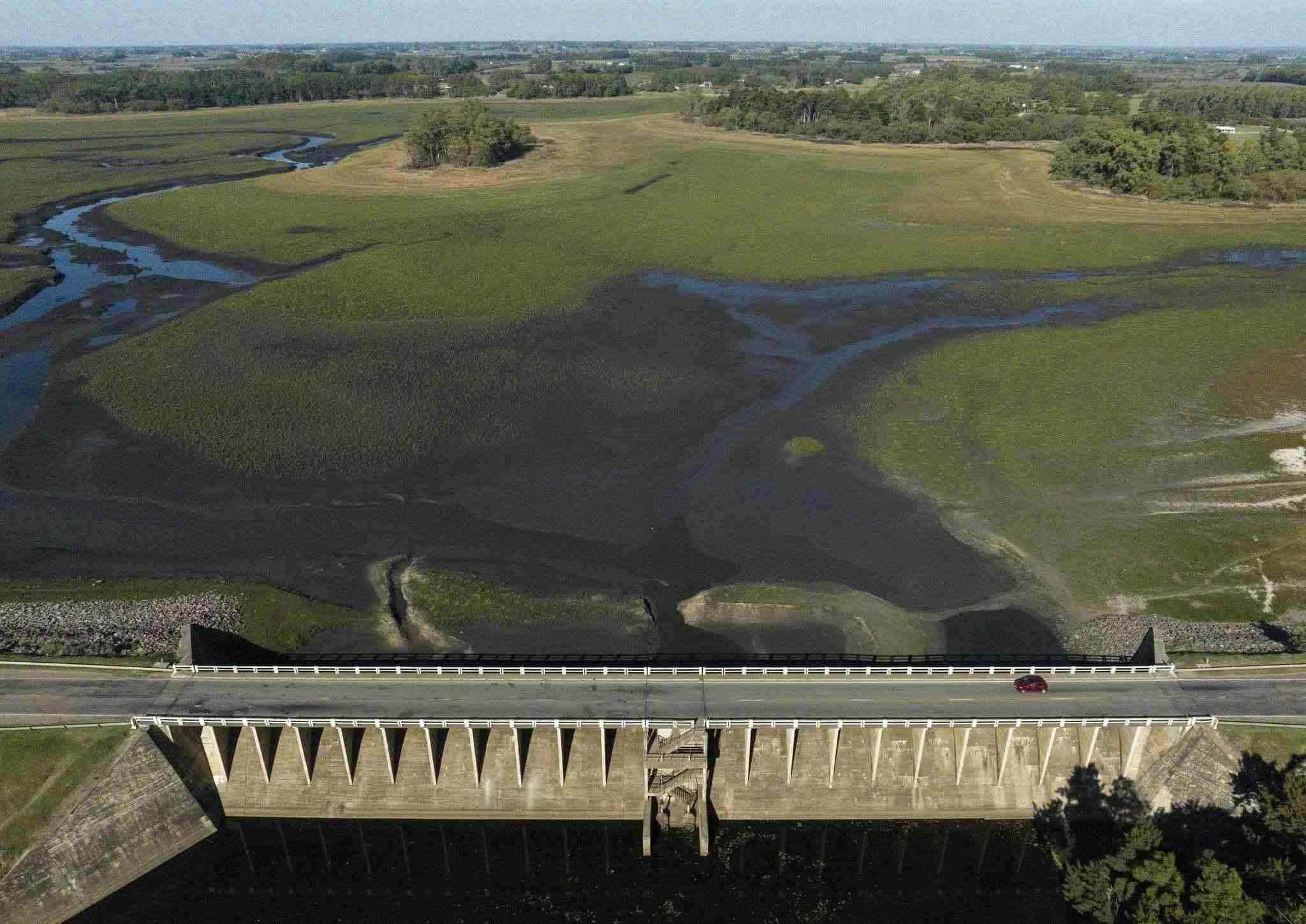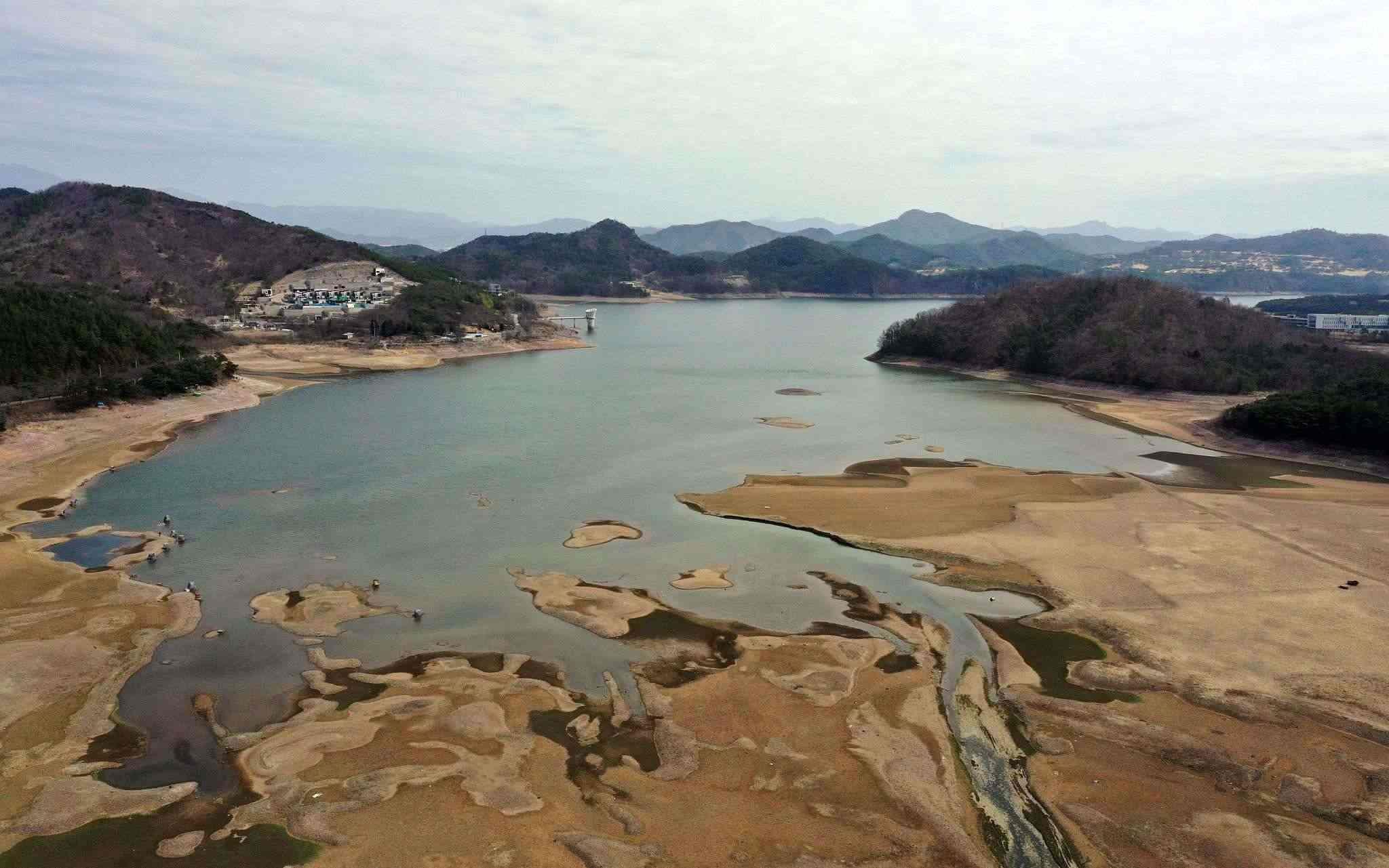 當(dāng)?shù)貢r(shí)間2023年3月21日,韓國羅州,羅州湖遭遇嚴(yán)重干旱,水量下降,河床裸露。