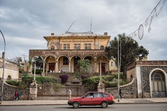 一輛汽車從厄立特里亞首都阿斯馬拉的阿斯馬拉歌劇院前駛過。