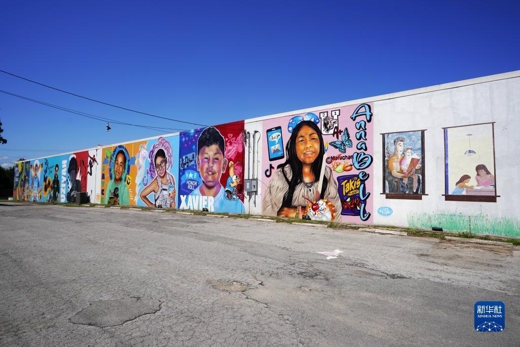 這是5月24日在美國(guó)得克薩斯州小城尤瓦爾迪拍攝的緬懷槍擊事件遇害者的墻繪。