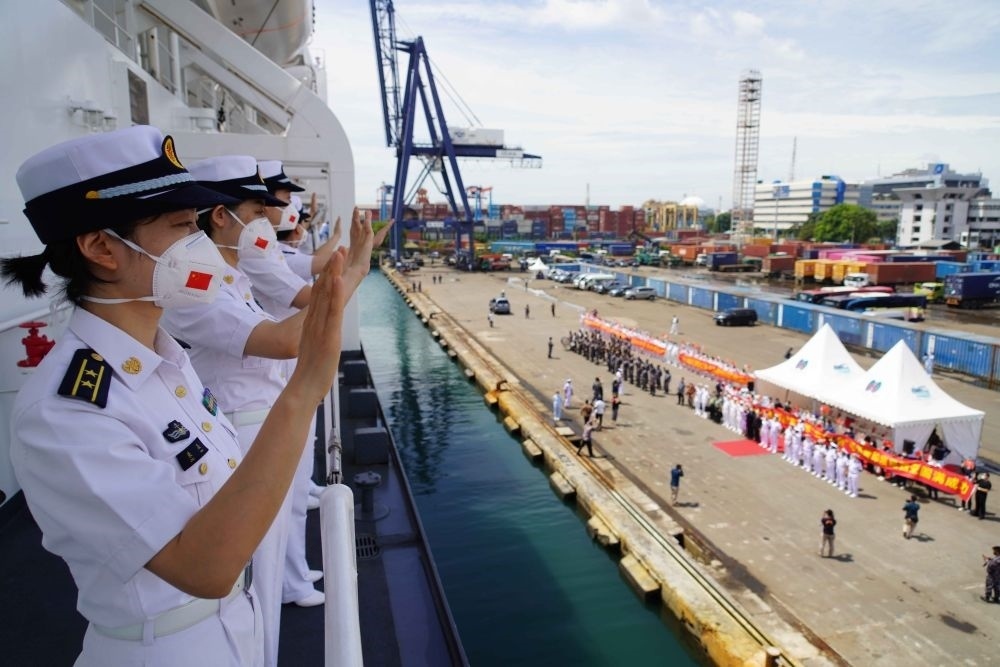 2022年11月18日,在印度尼西亞首都雅加達(dá)的丹戎不碌港,中國海軍“和平方舟”號醫(yī)院船官兵向送行人員揮手告別。